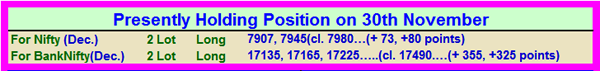 2. NF (2L) long at 7967............................booked at 7985 (+ 36 points) 3. NF BTST at 7952 taken on 27th Nov.............carried 4. BNF BTST at 17345 taken on 27th Nov. .........carried